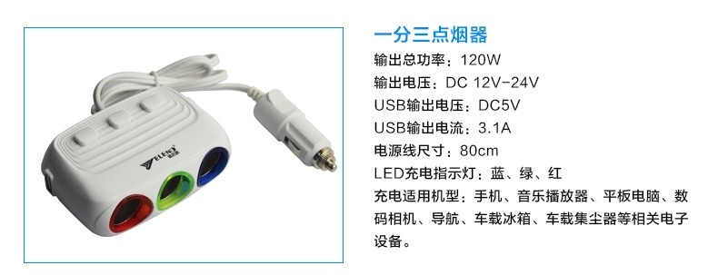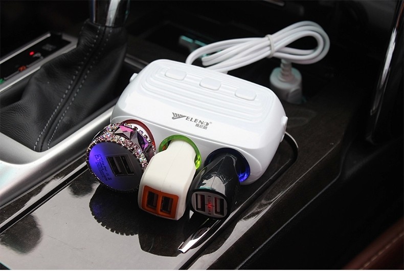 » 汽车用带开关一分三车载充电器一拖二usb电源分配器